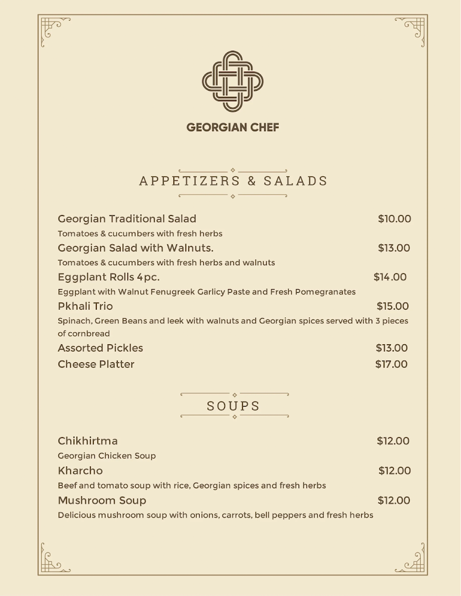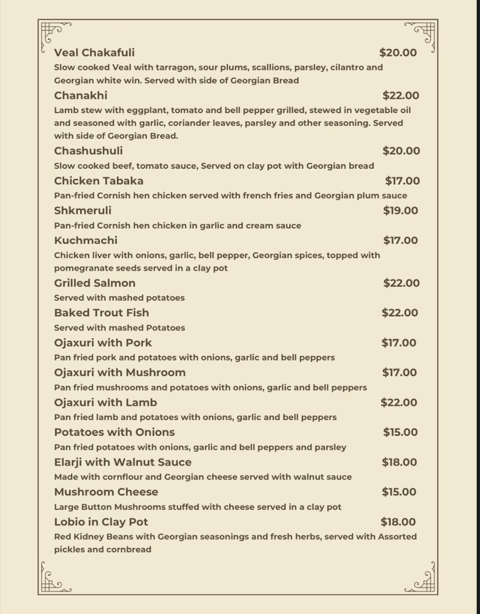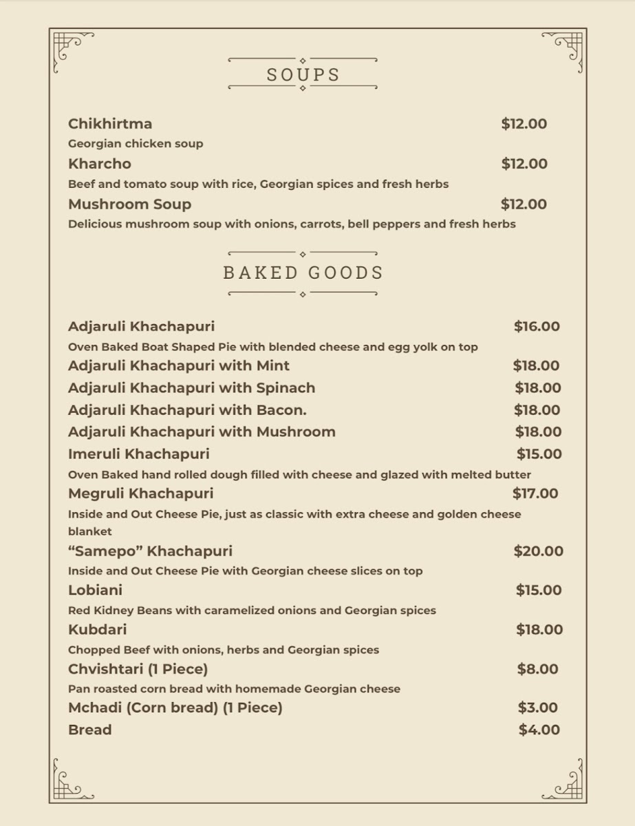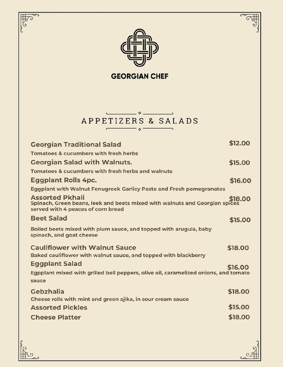 Step into a world of bold flavors and rich traditions with the Georgian Chef Menu, where every dish tells a story of Georgia's vibrant culinary heritage. Located at 3720 US-9, Howell Township, NJ, this menu offers a delightful exploration of authentic Georgian cuisine, from tender meats to freshly baked bread and hearty stews. Whether you're in the mood for a warm, comforting bowl of kharcho or the famous khachapuri that brings a perfect blend of cheese and bread, there’s something to satisfy every craving.