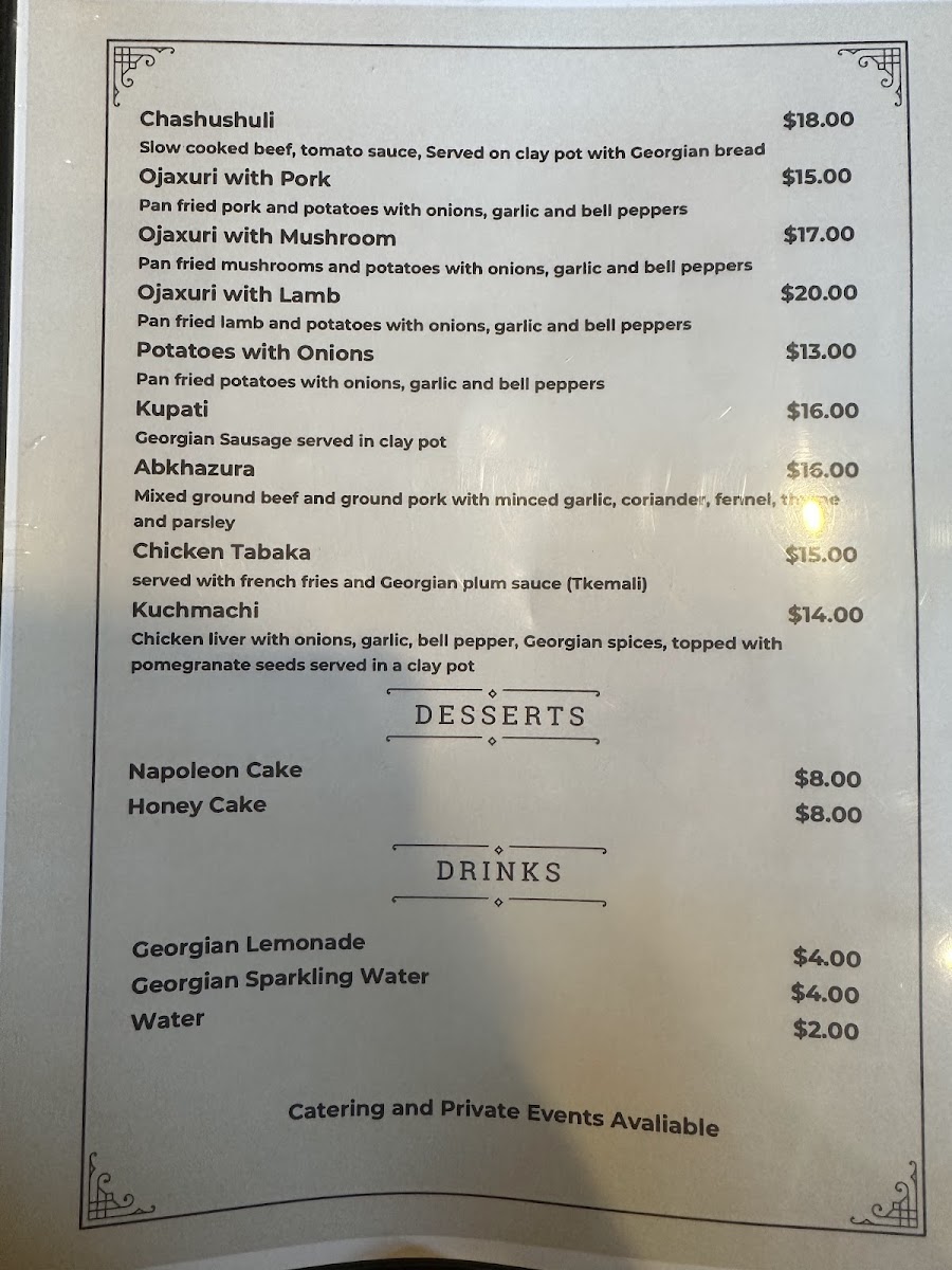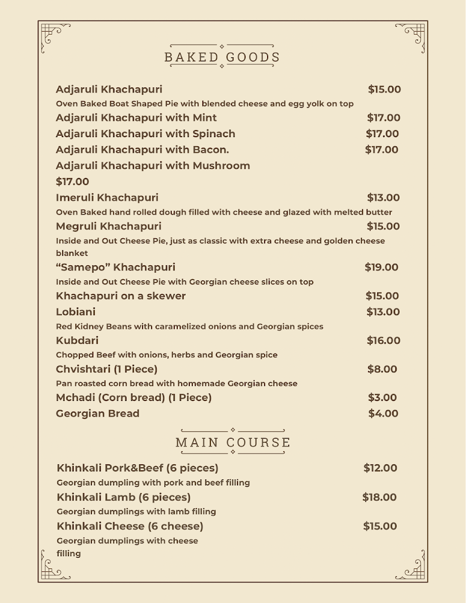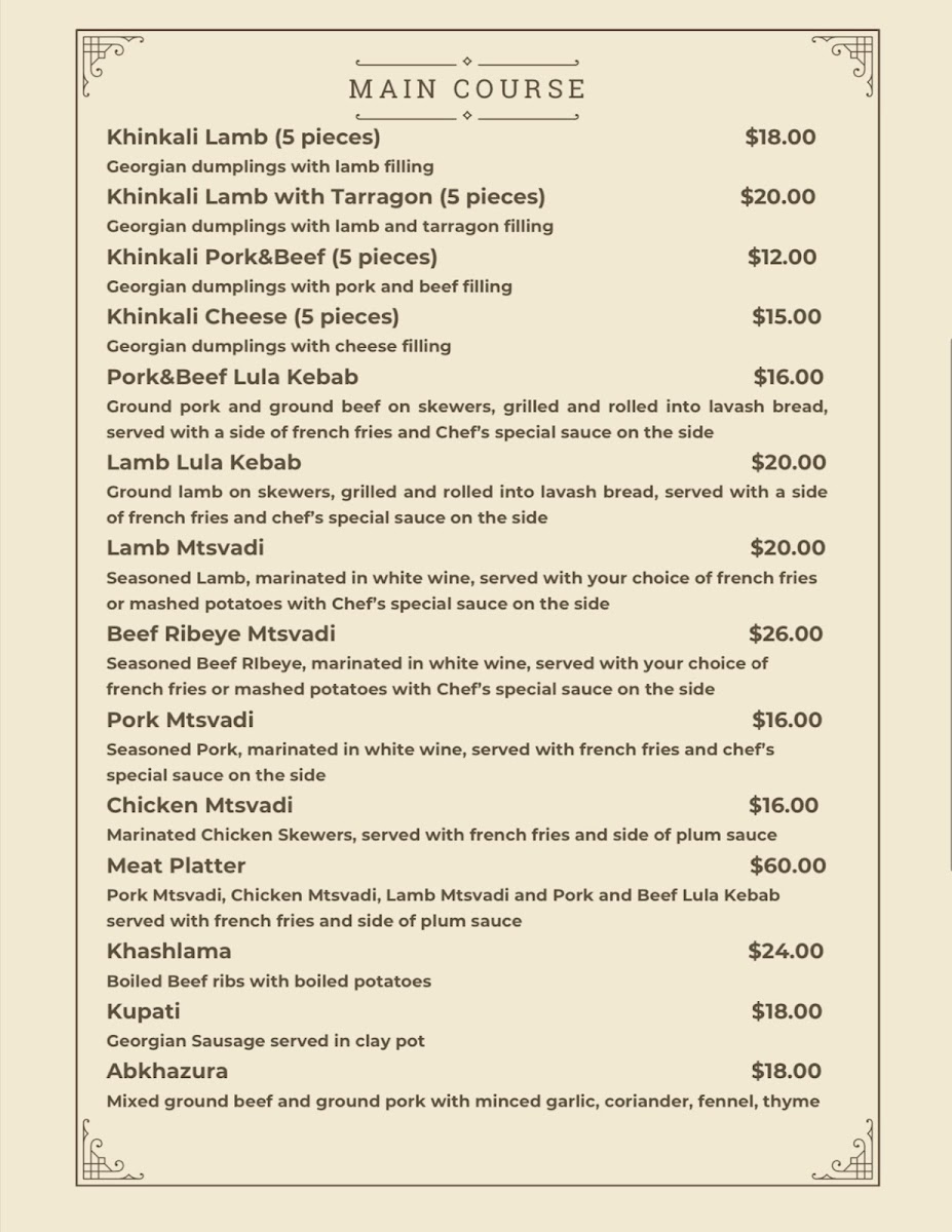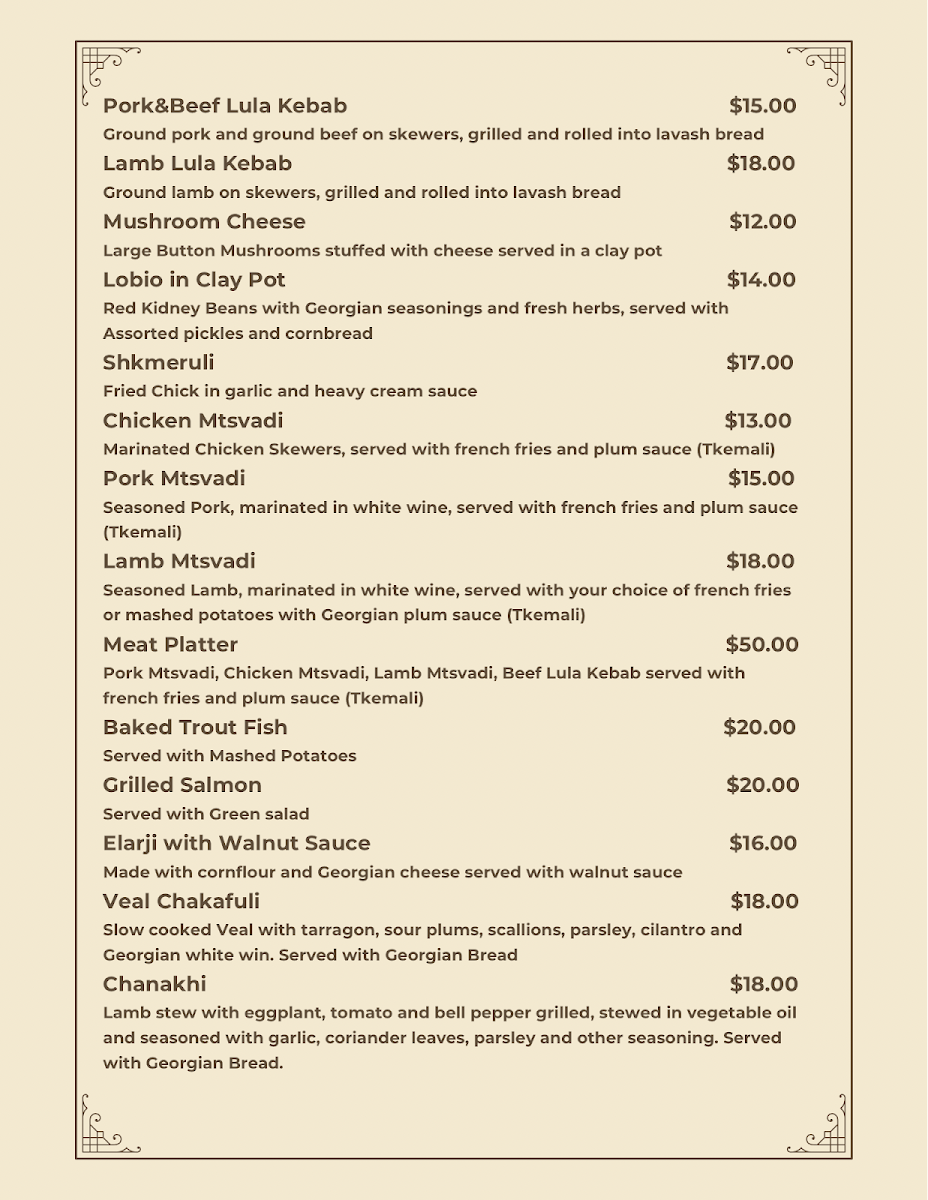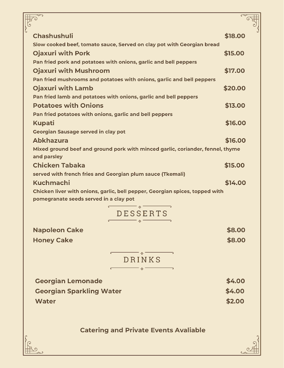 Step into a world of bold flavors and rich traditions with the Georgian Chef Menu, where every dish tells a story of Georgia's vibrant culinary heritage. Located at 3720 US-9, Howell Township, NJ, this menu offers a delightful exploration of authentic Georgian cuisine, from tender meats to freshly baked bread and hearty stews. Whether you're in the mood for a warm, comforting bowl of kharcho or the famous khachapuri that brings a perfect blend of cheese and bread, there’s something to satisfy every craving.